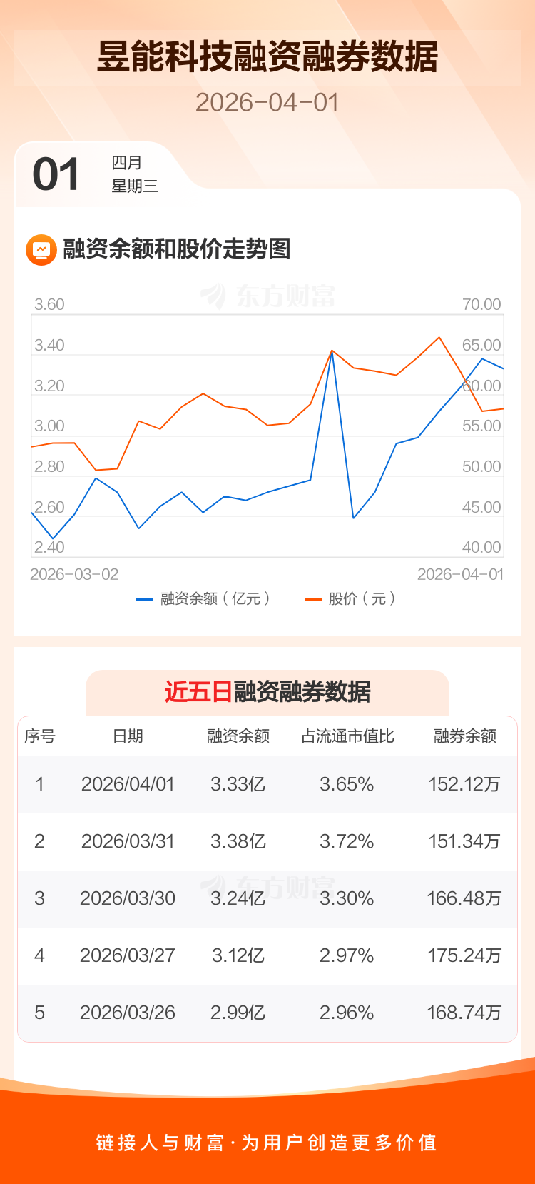 交易所最新数据显示,昱能科技于2026年4月1日获融资买入3846.58万元,融资偿还4337.65万元,当日融资净偿还491.06万元。目前,该股融资余额3.33亿,占流通市值比例为3.65%。