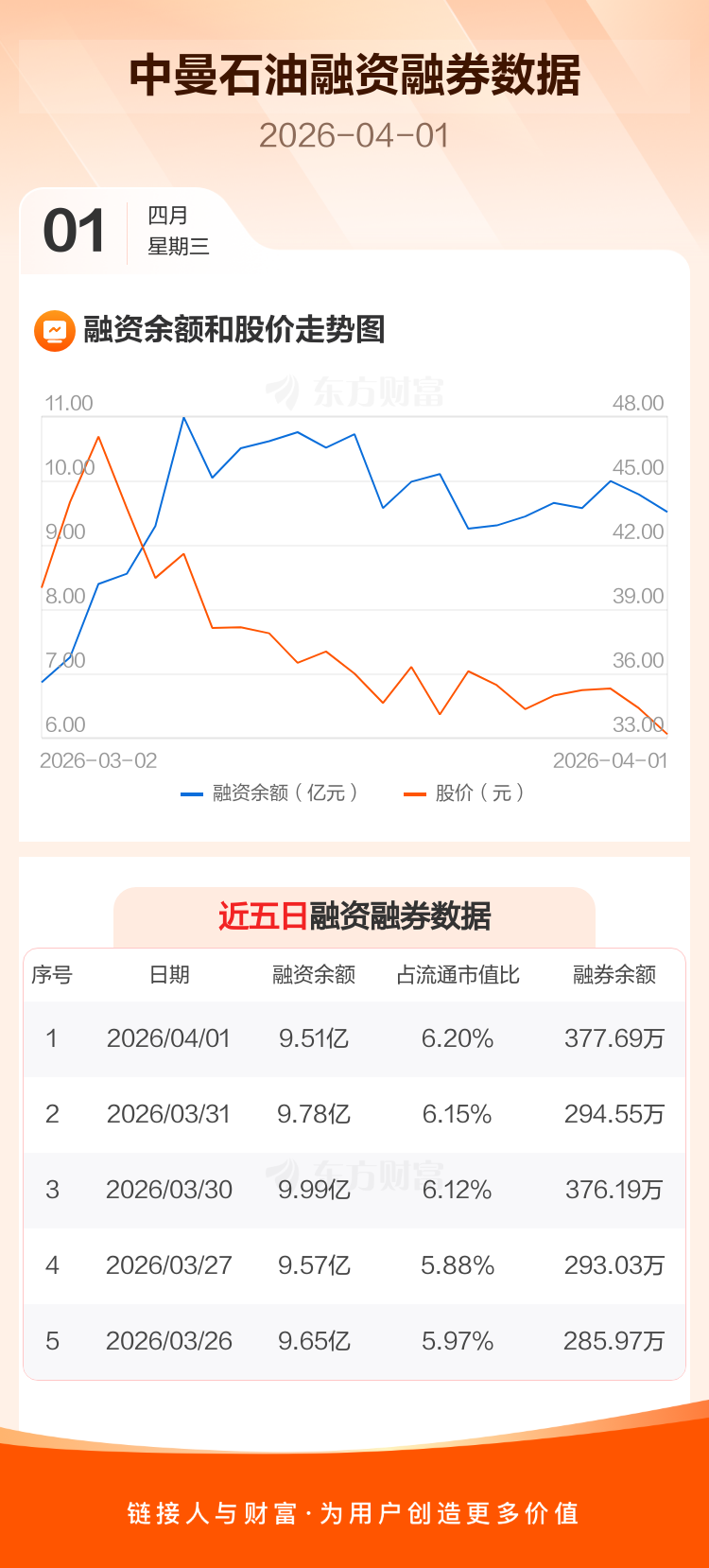 交易所最新数据显示,中曼石油于2026年4月1日获融资买入1.16亿元,融资偿还1.43亿元,当日融资净偿还2726.3万元。目前,该股融资余额9.51亿,占流通市值比例为6.20%。