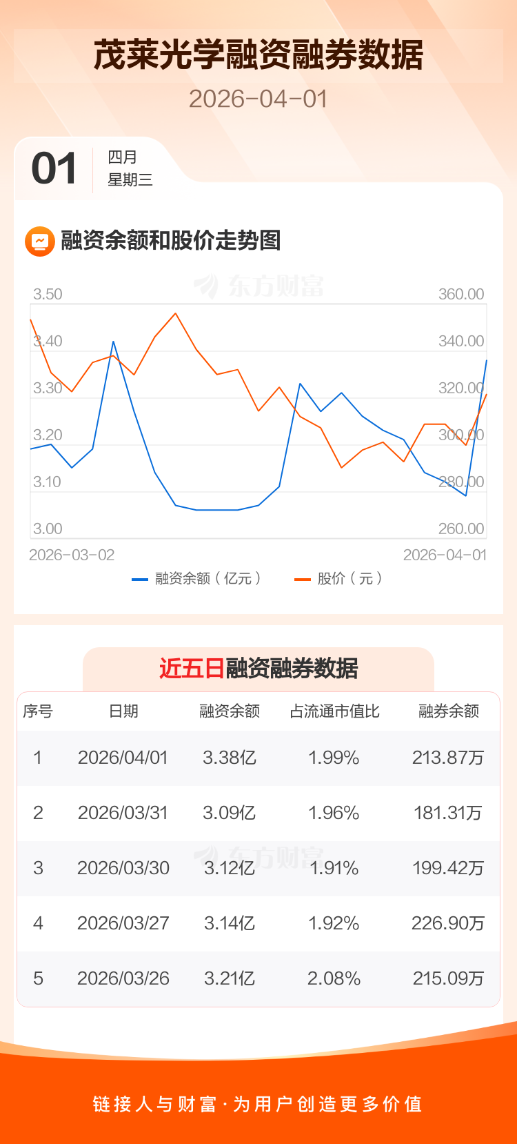 交易所最新数据显示,茂莱光学于2026年4月1日获融资买入5787.81万元,融资偿还2891.86万元,当日融资净买入2895.95万元。目前,该股融资余额3.38亿,占流通市值比例为1.99%。