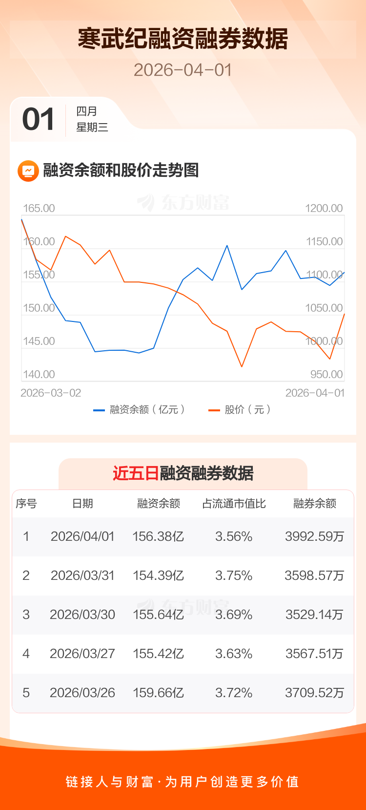 交易所最新数据显示,寒武纪于2026年4月1日获融资买入11.65亿元,融资偿还9.66亿元,当日融资净买入1.99亿元。目前,该股融资余额156.38亿,占流通市值比例为3.56%。