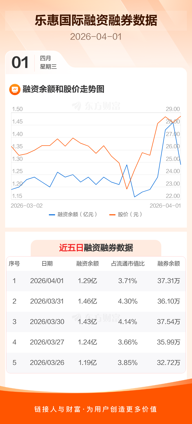 交易所最新数据显示,乐惠国际于2026年4月1日获融资买入1179.85万元,融资偿还2961.72万元,当日融资净偿还1781.87万元。目前,该股融资余额1.29亿,占流通市值比例为3.71%。