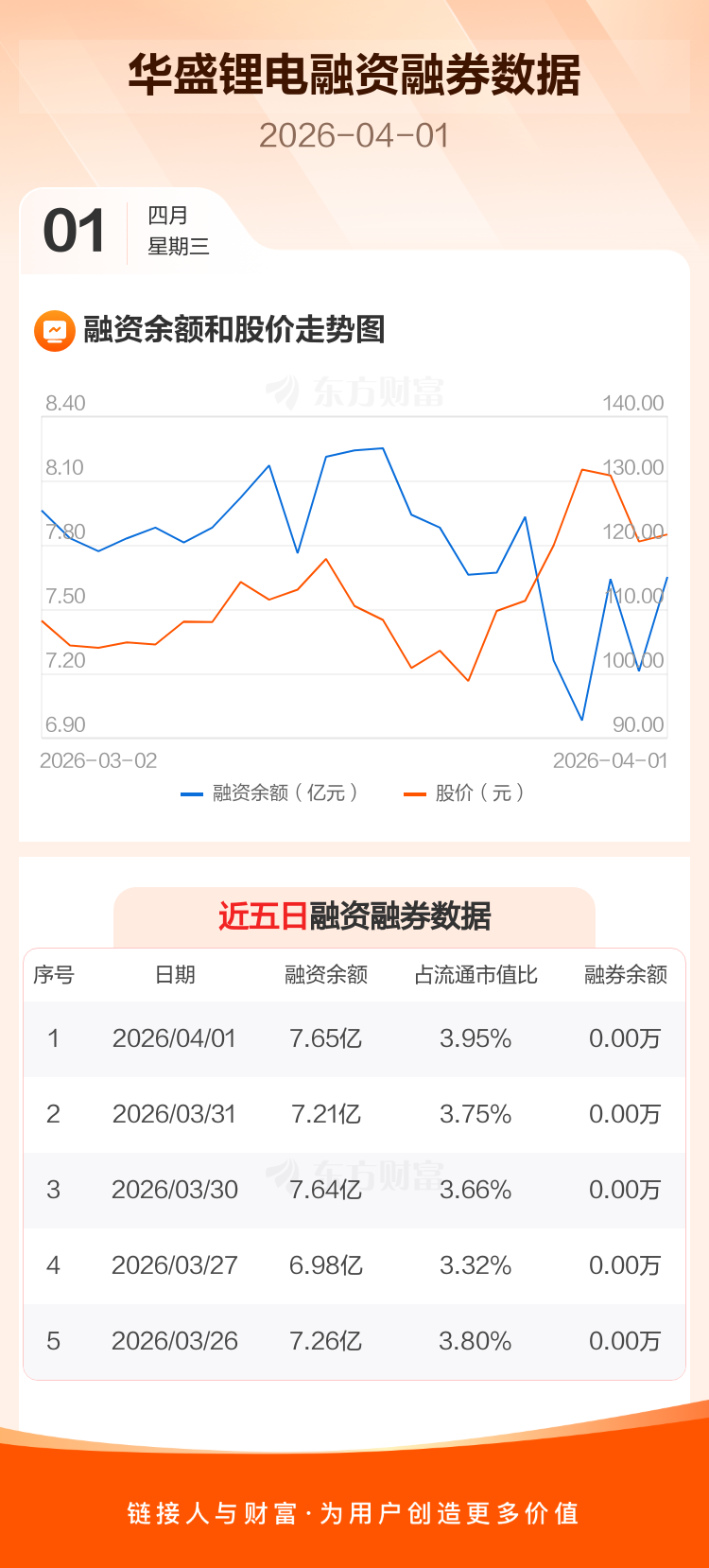 交易所最新数据显示,华盛锂电于2026年4月1日获融资买入1.55亿元,融资偿还1.11亿元,当日融资净买入4428.77万元。目前,该股融资余额7.65亿,占流通市值比例为3.95%。
