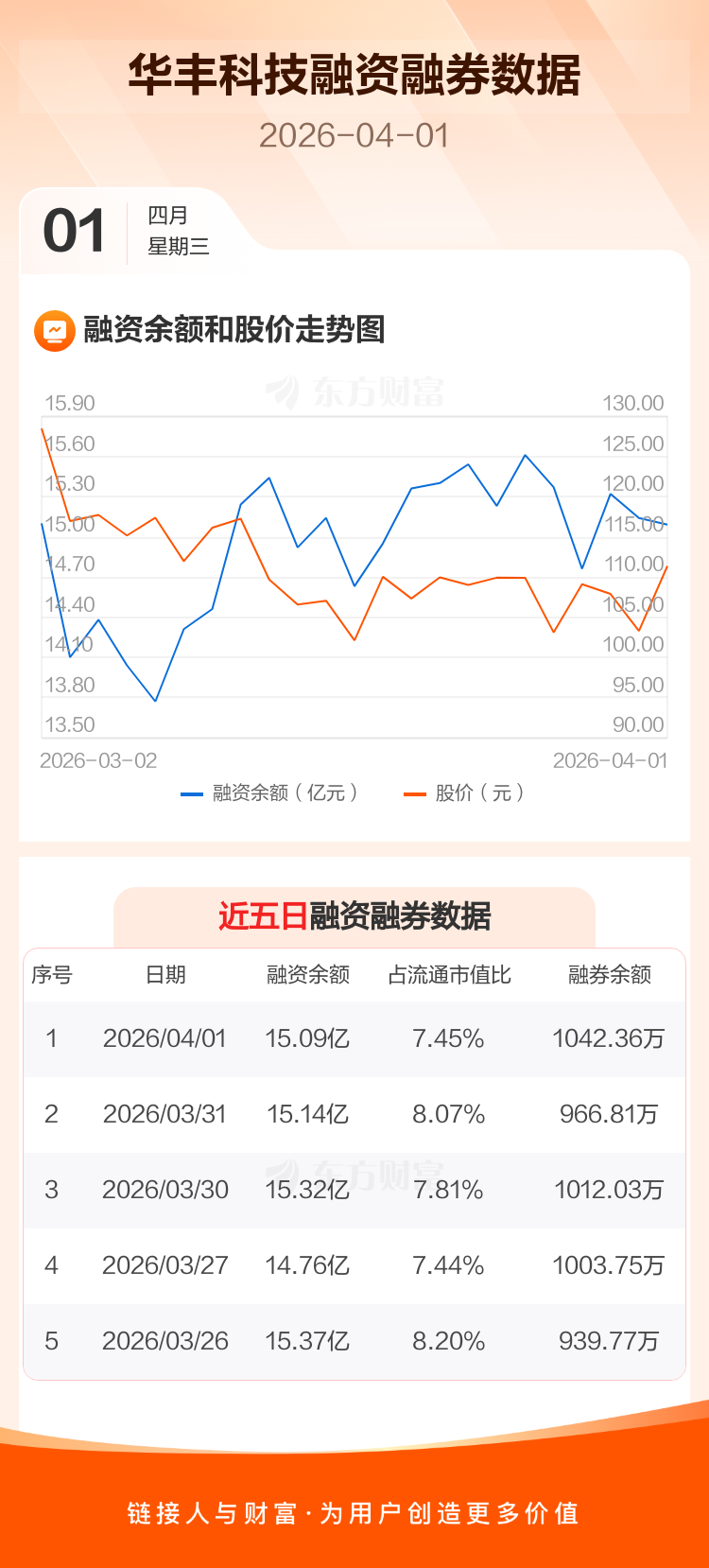 交易所最新数据显示,华丰科技于2026年4月1日获融资买入2.51亿元,融资偿还2.57亿元,当日融资净偿还575.35万元。目前,该股融资余额15.09亿,占流通市值比例为7.45%。