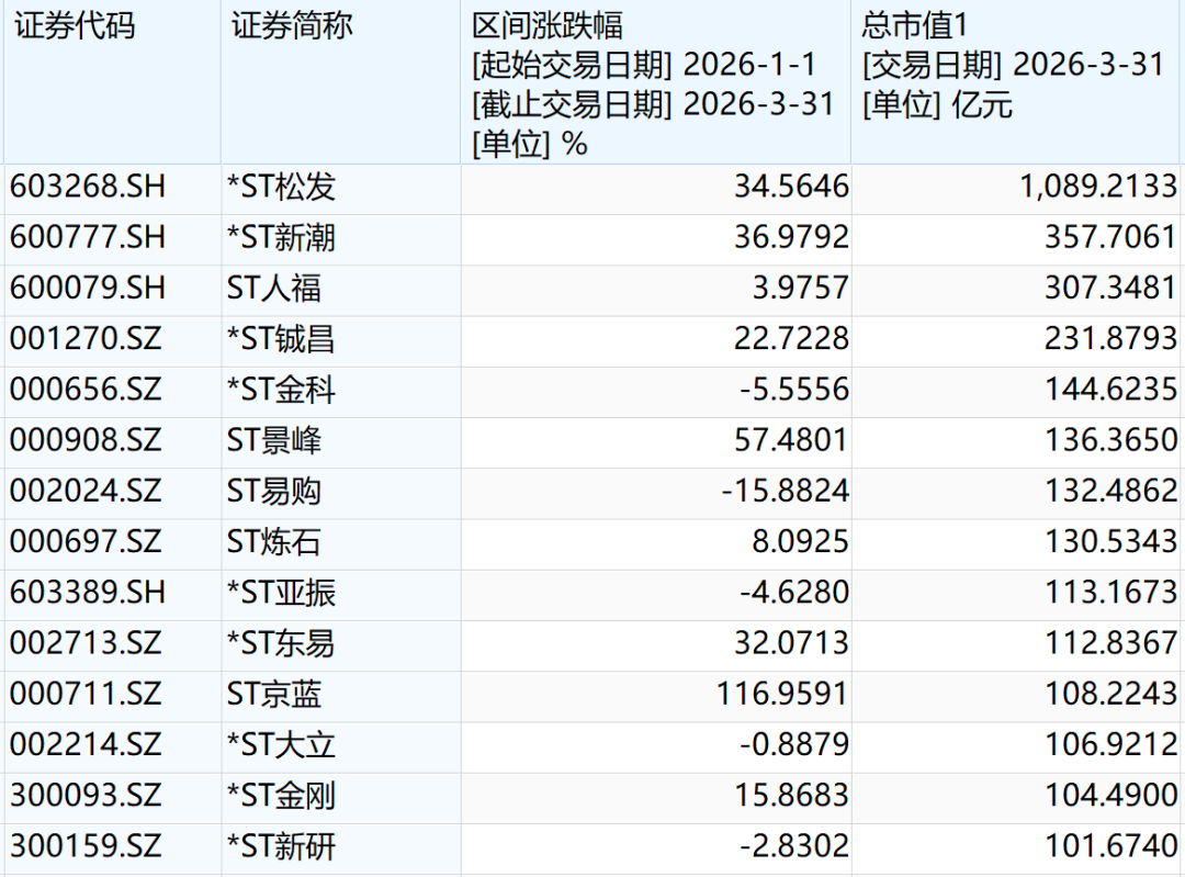 此外,A股百亿市值ST公司群体也在持续扩容。Wind数据显示,截至3月31日,已有14家ST公司市值超过100亿元,较去年同期新增5家,其中*ST新潮、ST人福等多家公司市值超过300亿元。