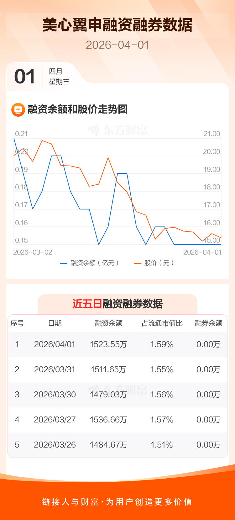 交易所最新数据显示,美心翼申于2026年4月1日获融资买入80.45万元,融资偿还68.55万元,当日融资净买入11.9万元。目前,该股融资余额1523.55万,占流通市值比例为1.59%。
