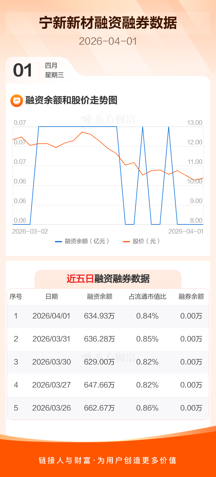 交易所最新数据显示,宁新新材于2026年4月1日获融资买入0元,融资偿还1.35万元,当日融资净偿还1.35万元。目前,该股融资余额634.93万,占流通市值比例为0.84%。