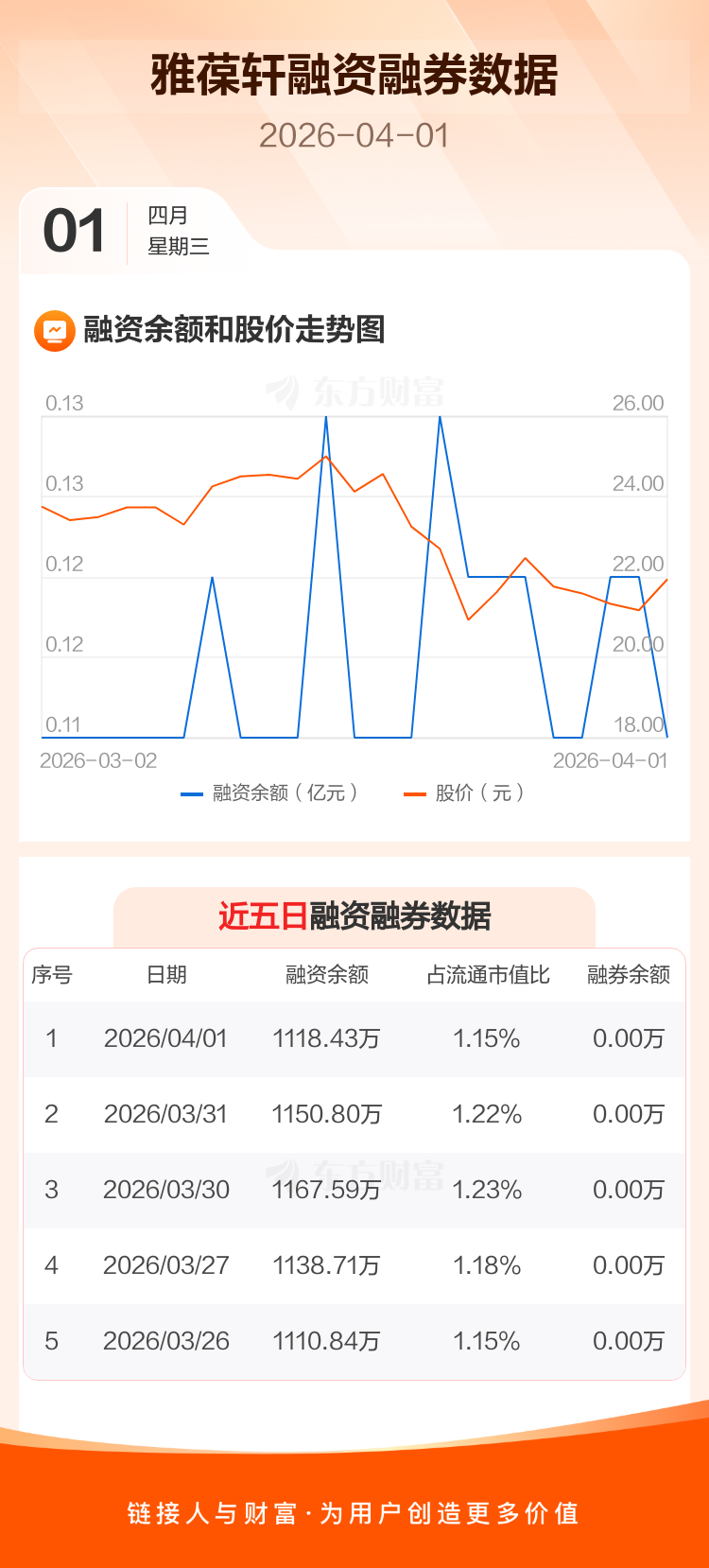 交易所最新数据显示,雅葆轩于2026年4月1日获融资买入83.19万元,融资偿还115.56万元,当日融资净偿还32.37万元。目前,该股融资余额1118.43万,占流通市值比例为1.15%。