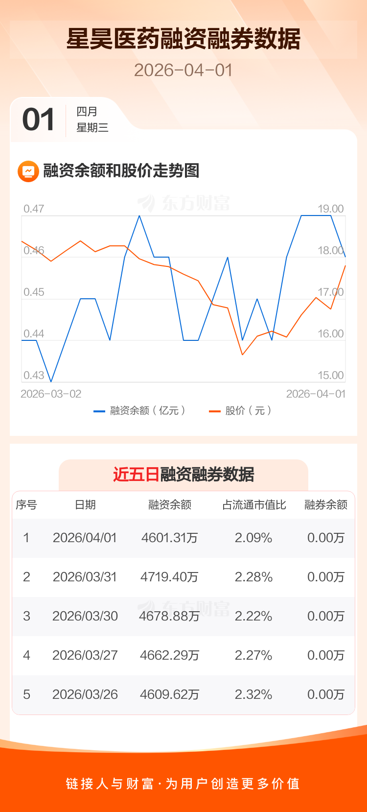 交易所最新数据显示,星昊医药于2026年4月1日获融资买入455.96万元,融资偿还574.05万元,当日融资净偿还118.09万元。目前,该股融资余额4601.31万,占流通市值比例为2.09%。