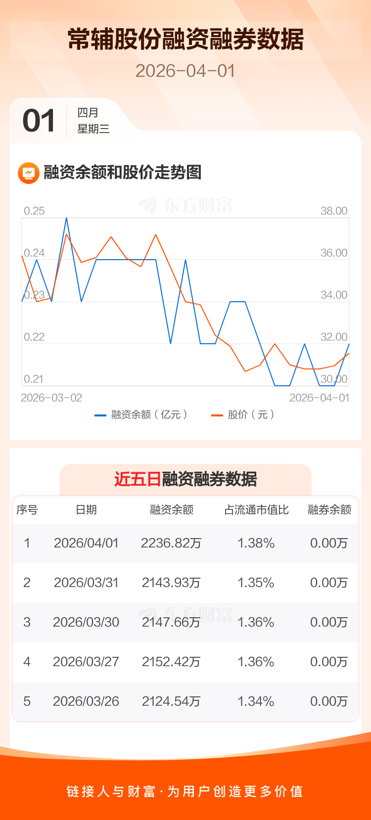 交易所最新数据显示,常辅股份于2026年4月1日获融资买入195.82万元,融资偿还102.93万元,当日融资净买入92.89万元。目前,该股融资余额2236.82万,占流通市值比例为1.38%。