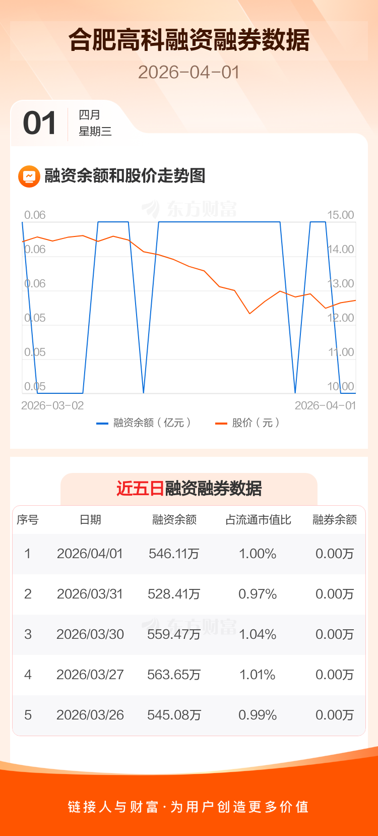 交易所最新数据显示,合肥高科于2026年4月1日获融资买入37.20万元,融资偿还19.50万元,当日融资净买入17.7万元。目前,该股融资余额546.11万,占流通市值比例为1.00%。