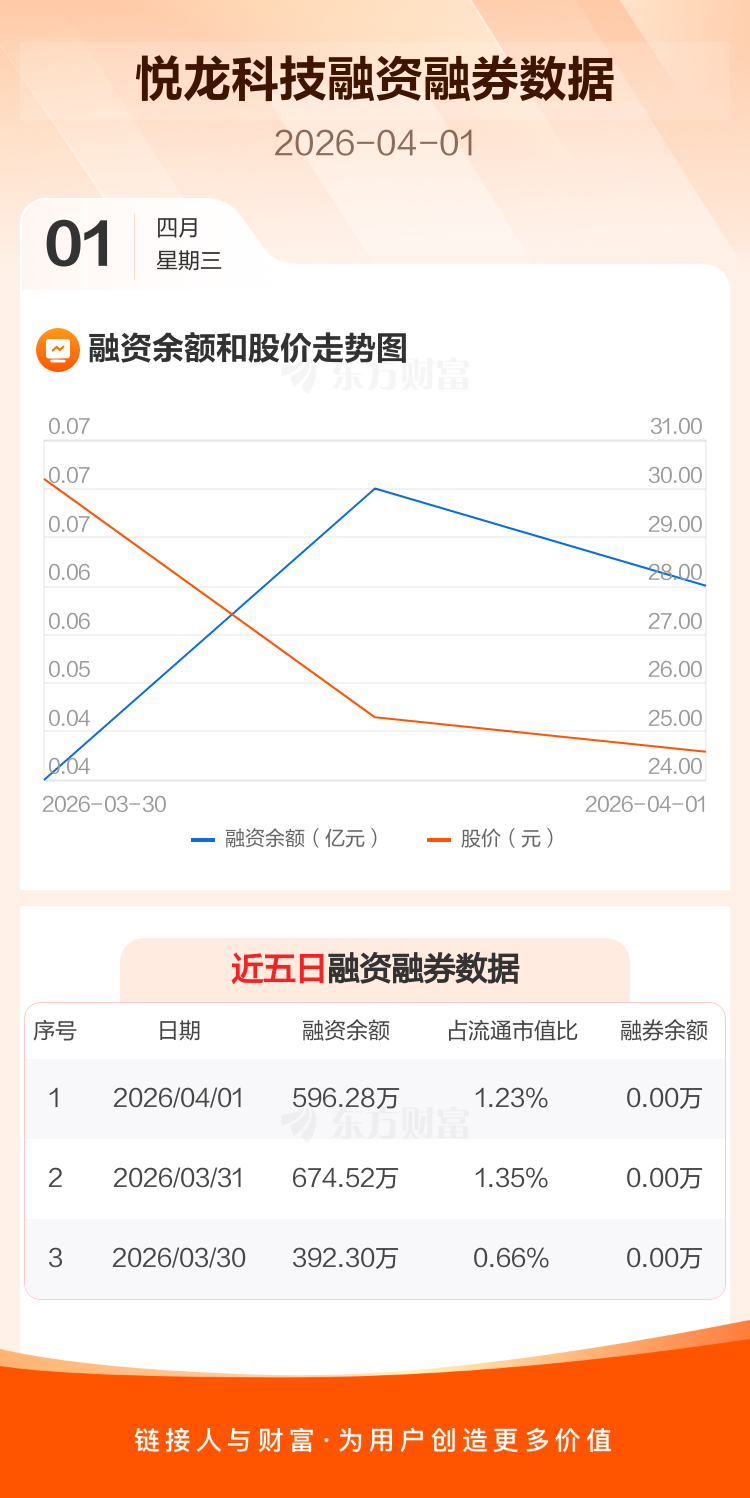 交易所最新数据显示,悦龙科技于2026年4月1日获融资买入278.41万元,融资偿还356.64万元,当日融资净偿还78.24万元。目前,该股融资余额596.28万,占流通市值比例为1.23%。
