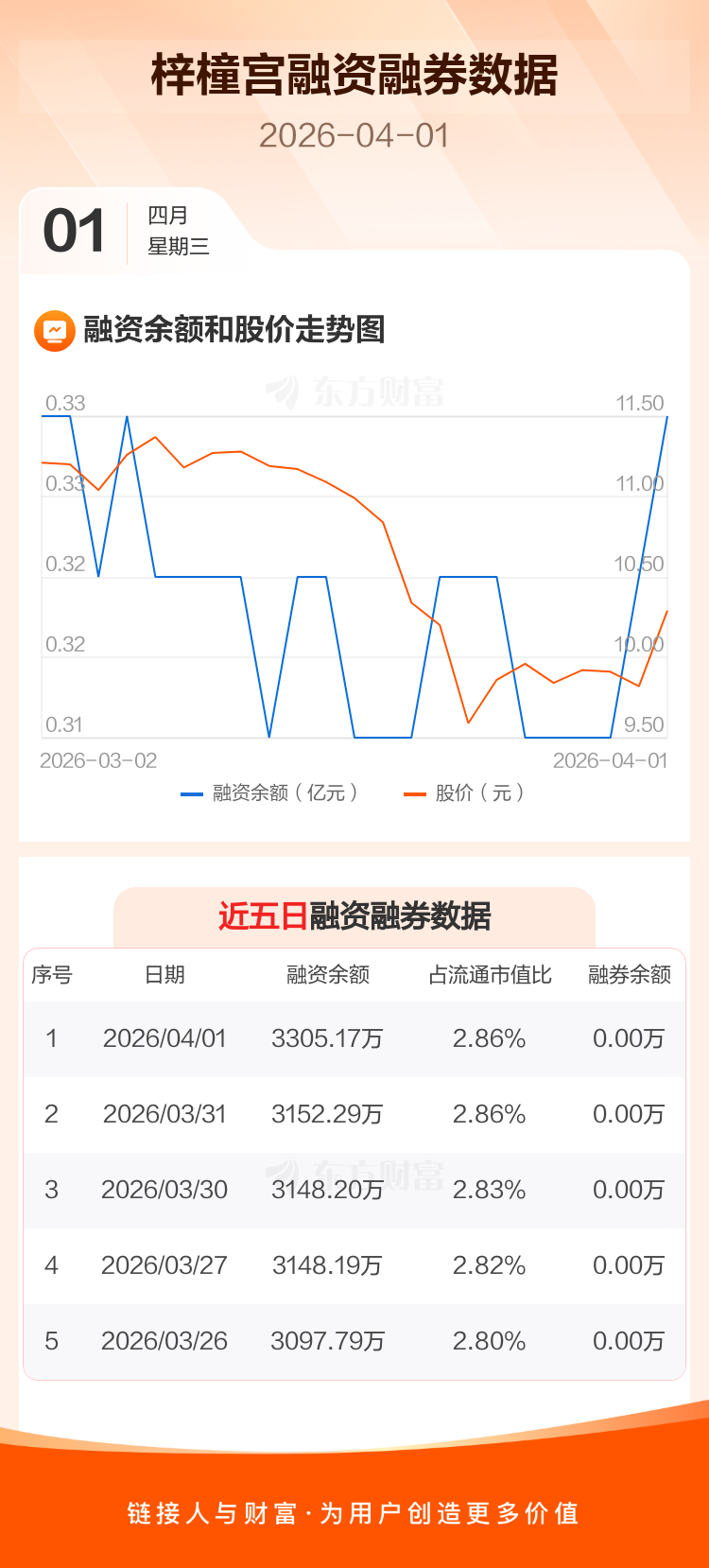 交易所最新数据显示,梓橦宫于2026年4月1日获融资买入294.80万元,融资偿还141.92万元,当日融资净买入152.88万元。目前,该股融资余额3305.17万,占流通市值比例为2.86%。