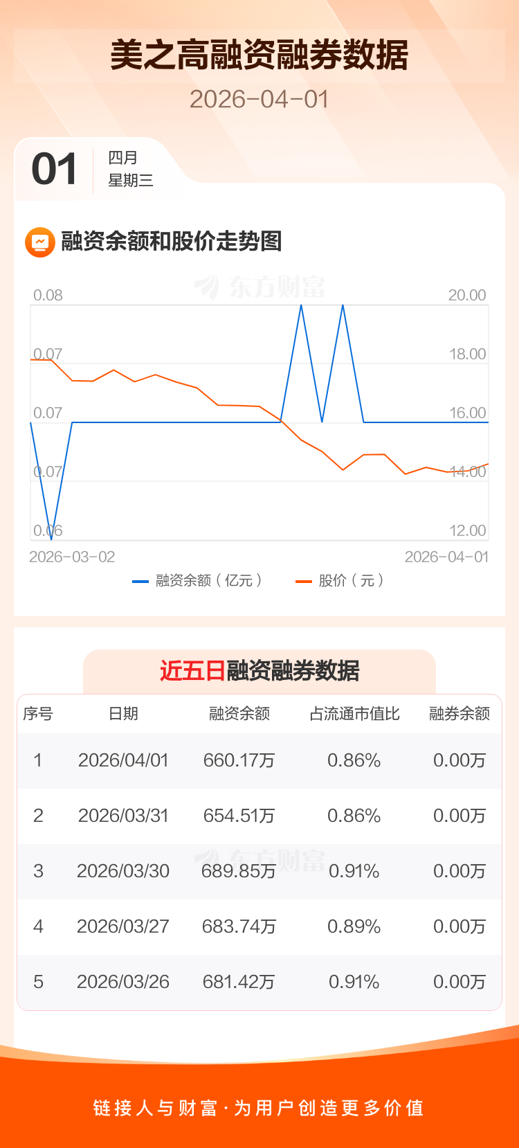 交易所最新数据显示,美之高于2026年4月1日获融资买入28.66万元,融资偿还23.00万元,当日融资净买入5.66万元。目前,该股融资余额660.17万,占流通市值比例为0.86%。