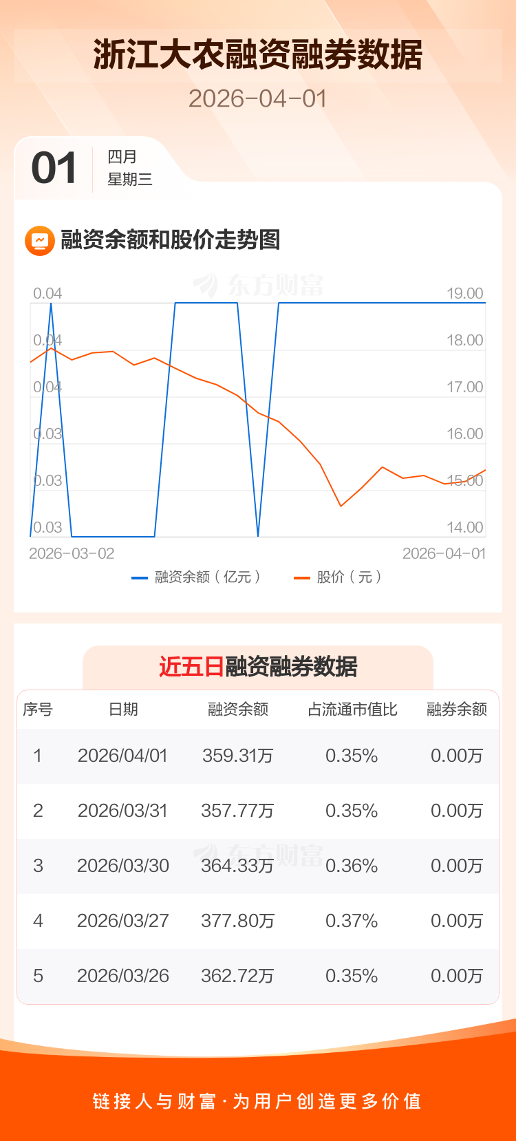 交易所最新数据显示,浙江大农于2026年4月1日获融资买入22.51万元,融资偿还20.97万元,当日融资净买入1.54万元。目前,该股融资余额359.31万,占流通市值比例为0.35%。