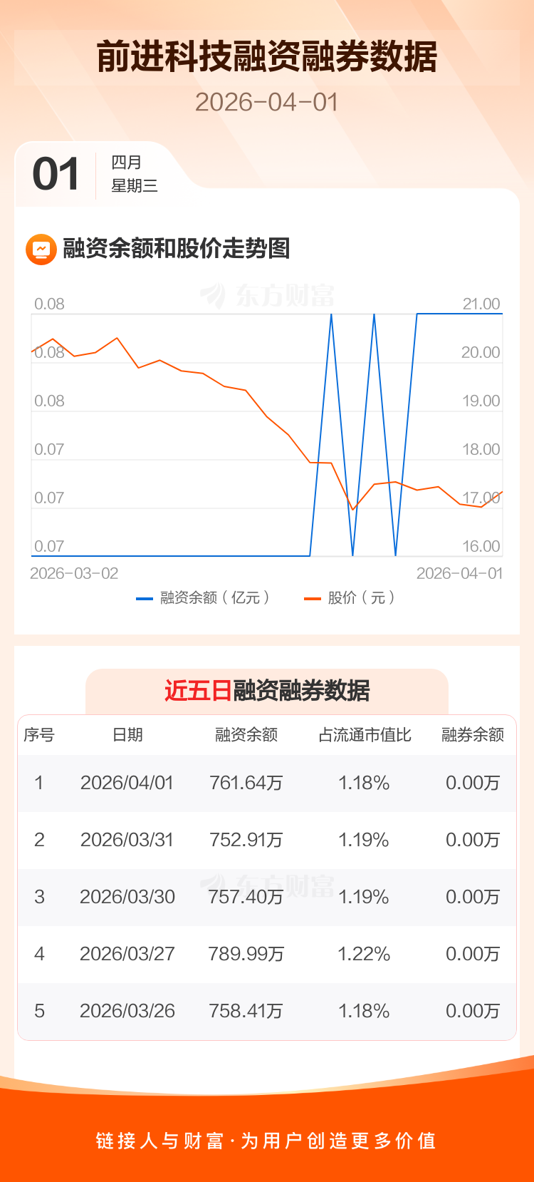 交易所最新数据显示,前进科技于2026年4月1日获融资买入14.22万元,融资偿还5.48万元,当日融资净买入8.73万元。目前,该股融资余额761.64万,占流通市值比例为1.18%。