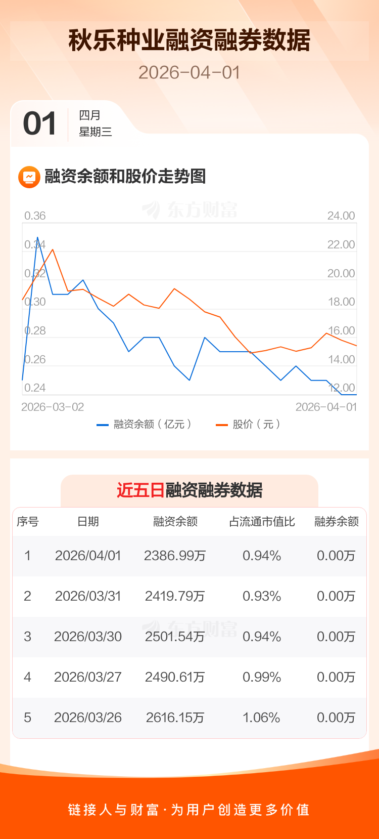 交易所最新数据显示,秋乐种业于2026年4月1日获融资买入287.74万元,融资偿还320.54万元,当日融资净偿还32.8万元。目前,该股融资余额2386.99万,占流通市值比例为0.94%。