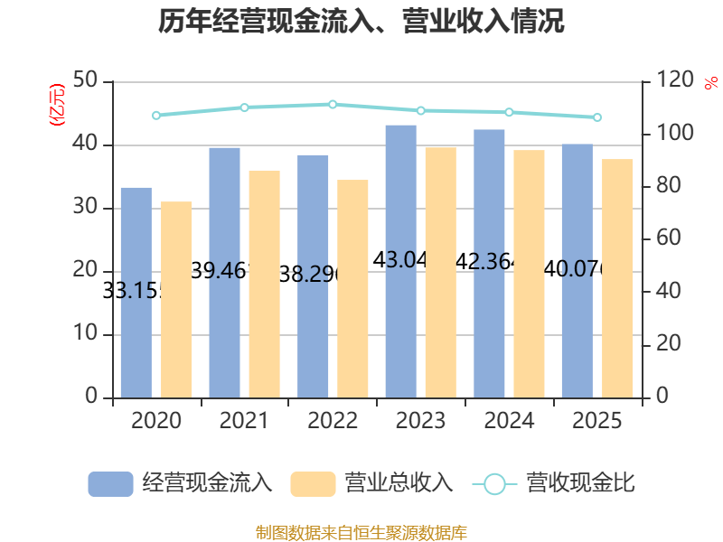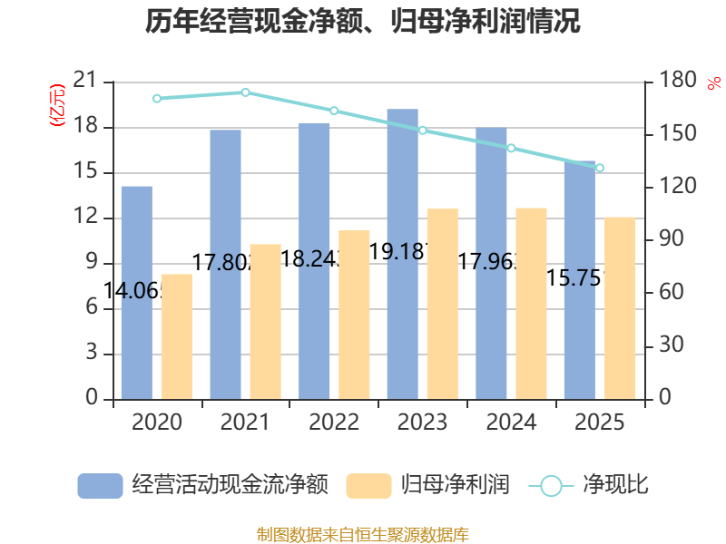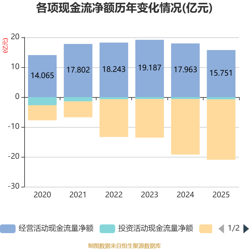 截至2025年,公司经营活动现金流净额为15.75亿元,同比下降12.32%;筹资活动现金流净额-20.21亿元,同比减少1.62亿元;投资活动现金流净额-7566.68万元,上年同期为-6363.94万元。