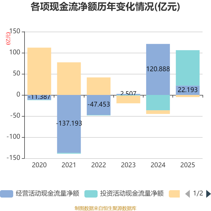 截至2025年,公司经营活动现金流净额为22.19亿元,同比下降81.64%;筹资活动现金流净额-5.03亿元,同比增加3.61亿元;投资活动现金流净额83.89亿元,上年同期为-36.34亿元。
