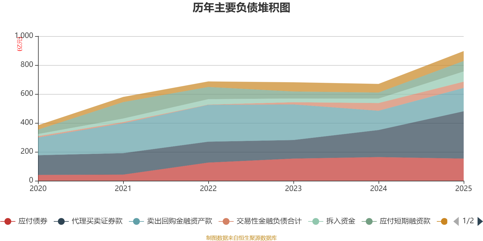 负债重大变化方面,截至2025年末,公司代理买卖证券款较上年末增加75.28%,占公司总资产比重上升7.44个百分点;应付债券较上年末减少6.54%,占公司总资产比重下降4.49个百分点;拆入资金较上年末增加127.64%,占公司总资产比重上升2.59个百分点;交易性金融负债合计较上年末减少19.47%,占公司总资产比重下降2.03个百分点。