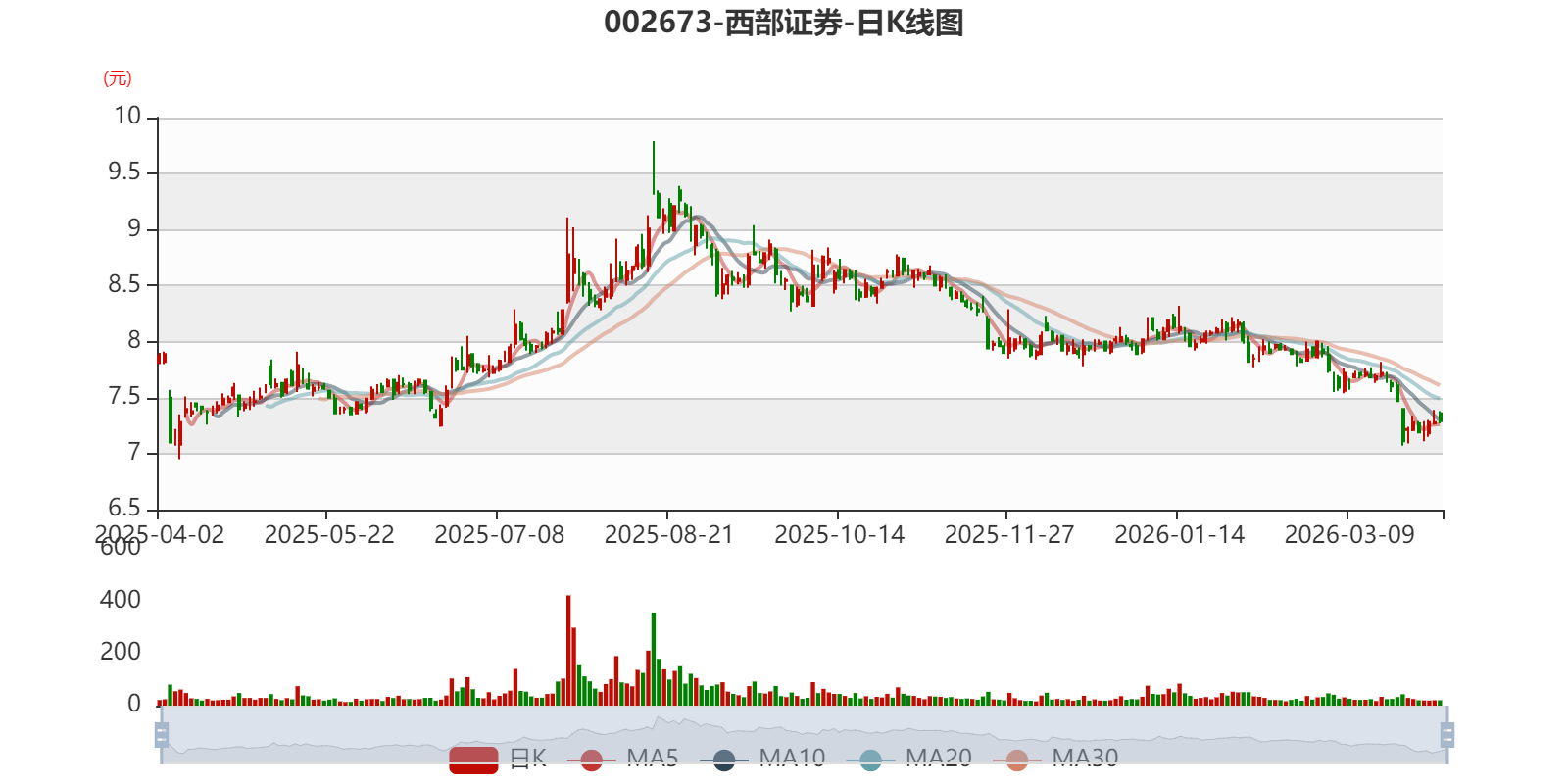 中证智能财讯西部证券(002673)4月2日披露2025年年度报告。2025年,公司实现营业总收入59.85亿元,同比下降10.84%;归母净利润17.54亿元,同比增长24.97%;扣非净利润17.36亿元,同比增长25.36%;经营活动产生的现金流量净额为22.19亿元,同比下降81.64%;报告期内,西部证券基本每股收益为0.3929元,加权平均净资产收益率为5.95%。公司2025年度分配预案为:拟向全体股东每10股派现0.9元(含税)。