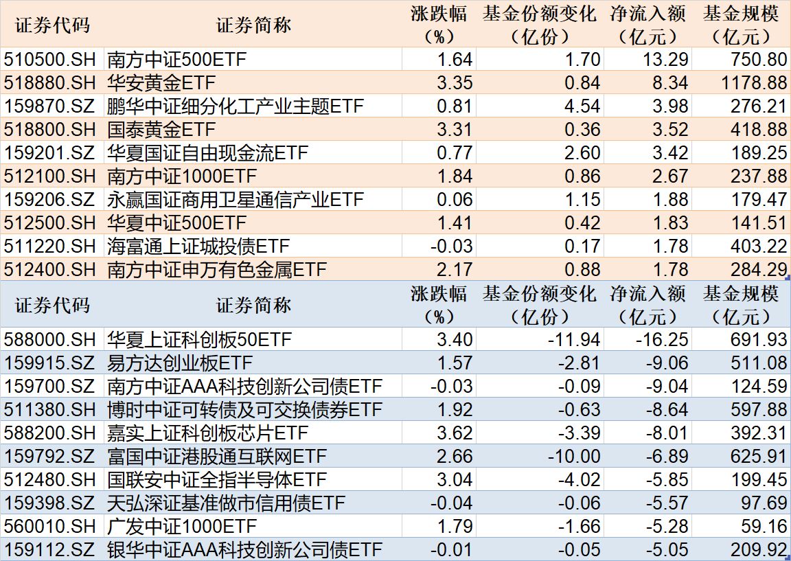 ETF规模速报 | 中证500ETF南方净流入超13亿元,科创50ETF华夏净流出超16亿元