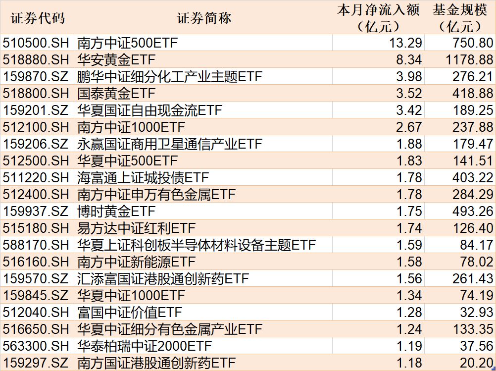截至4月1日,本月资金净流入额居前20的ETF名单如下: