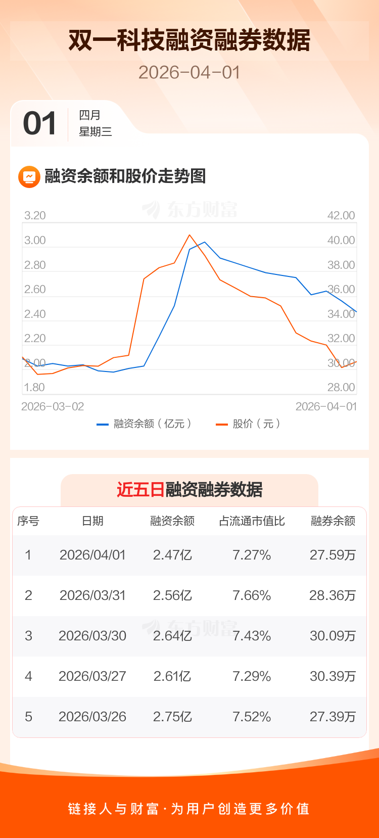 交易所最新数据显示,双一科技于2026年4月1日获融资买入2802.93万元,融资偿还3711.94万元,当日融资净偿还909.01万元。目前,该股融资余额2.47亿,占流通市值比例为7.27%。