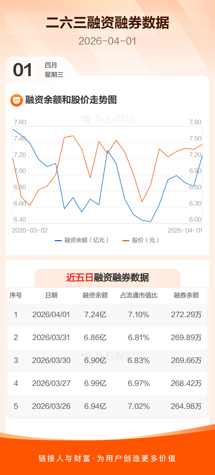 交易所最新数据显示,二六三于2026年4月1日获融资买入1.54亿元,融资偿还1.17亿元,当日融资净买入3717.4万元。目前,该股融资余额7.24亿,占流通市值比例为7.10%。