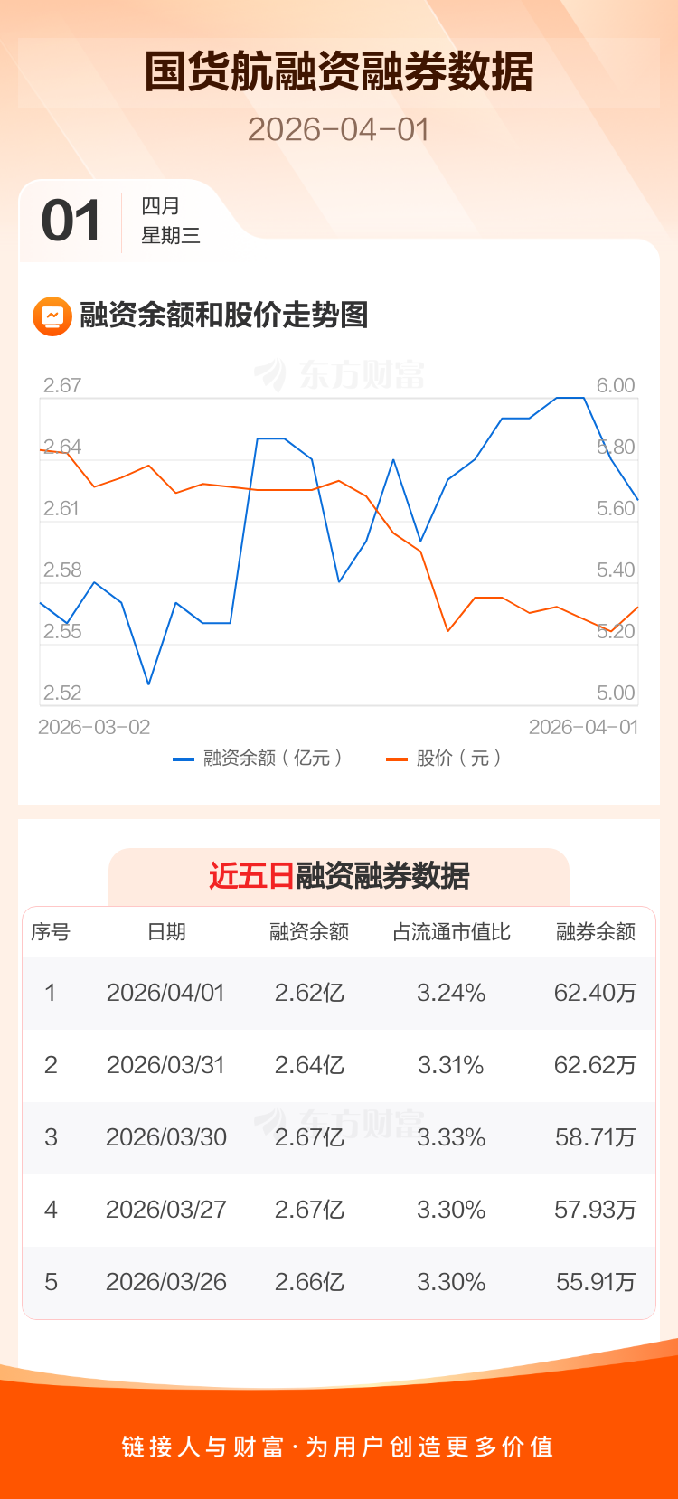 交易所最新数据显示,国货航于2026年4月1日获融资买入531.96万元,融资偿还728.01万元,当日融资净偿还196.05万元。目前,该股融资余额2.62亿,占流通市值比例为3.24%。
