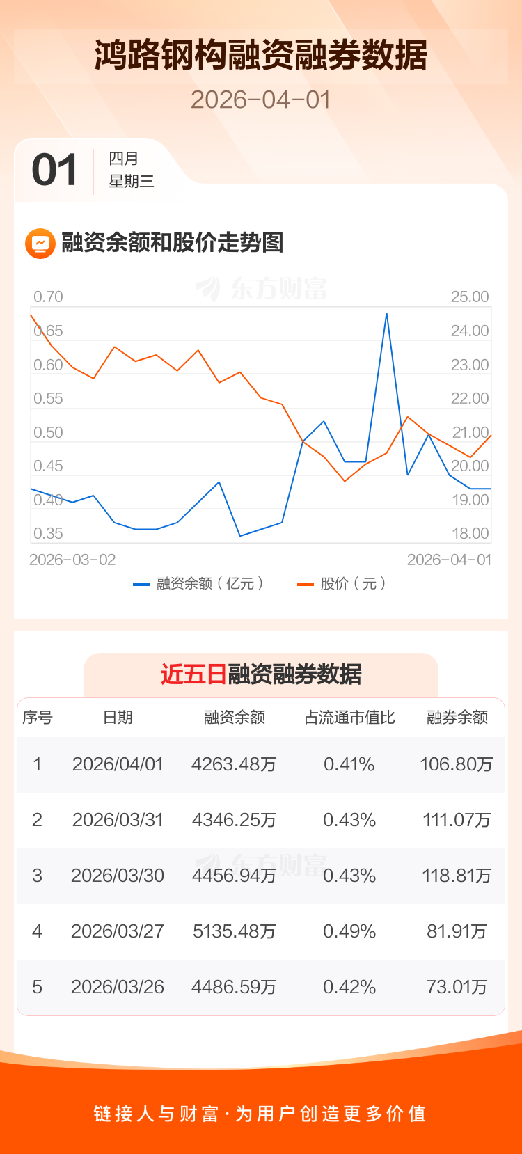 交易所最新数据显示,鸿路钢构于2026年4月1日获融资买入609.02万元,融资偿还691.80万元,当日融资净偿还82.78万元。目前,该股融资余额4263.48万,占流通市值比例为0.41%。