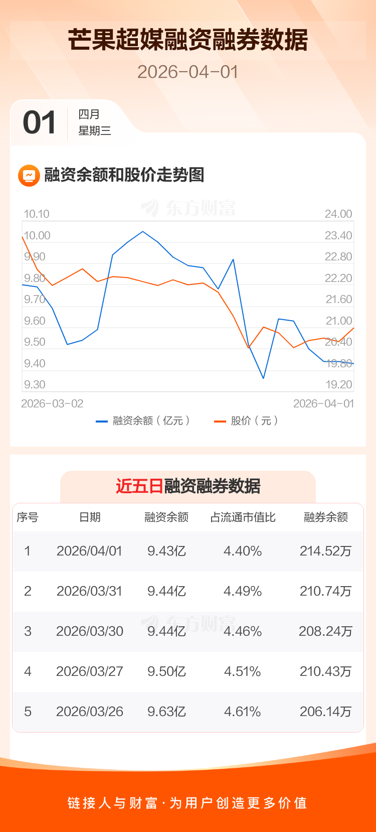 交易所最新数据显示,芒果超媒于2026年4月1日获融资买入2232.32万元,融资偿还2324.15万元,当日融资净偿还91.83万元。目前,该股融资余额9.43亿,占流通市值比例为4.40%。
