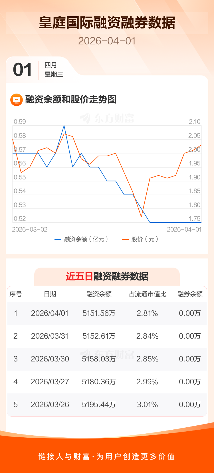 交易所最新数据显示,皇庭国际于2026年4月1日获融资买入36.10万元,融资偿还37.15万元,当日融资净偿还1.05万元。目前,该股融资余额5151.56万,占流通市值比例为2.81%。