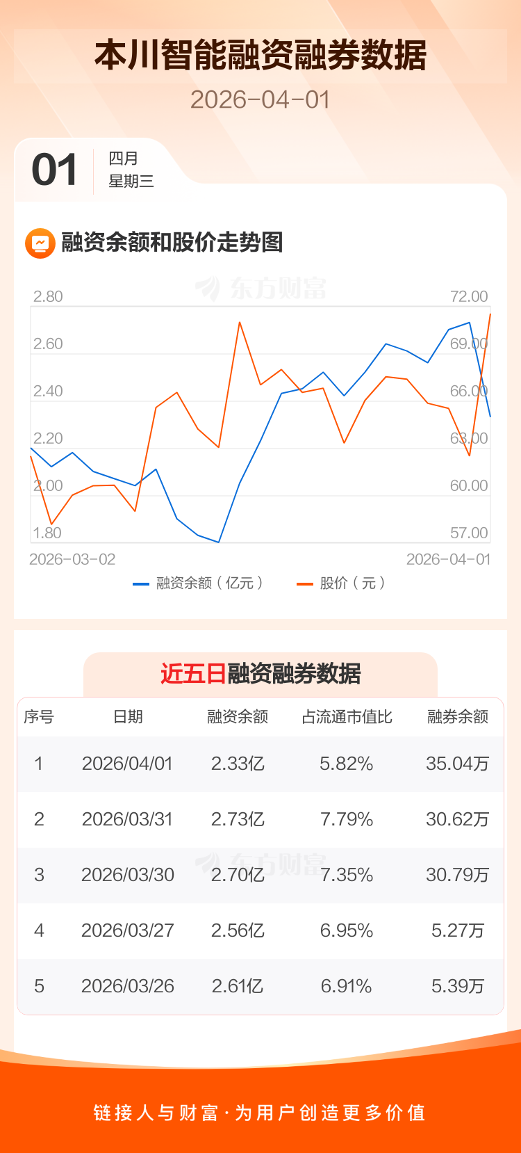 交易所最新数据显示,本川智能于2026年4月1日获融资买入8158.29万元,融资偿还1.21亿元,当日融资净偿还3944.02万元。目前,该股融资余额2.33亿,占流通市值比例为5.82%。