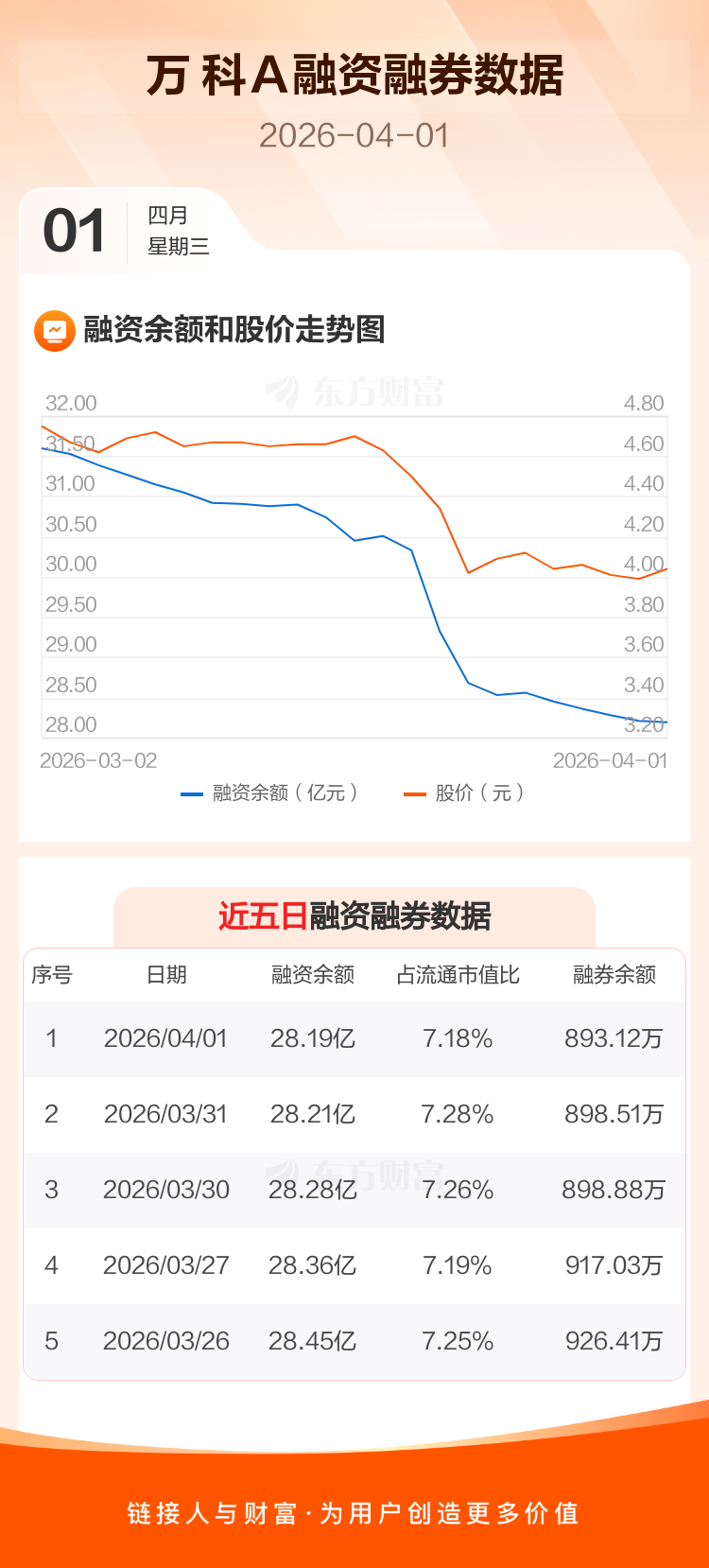 交易所最新数据显示,万 科A于2026年4月1日获融资买入7000.43万元,融资偿还7239.67万元,当日融资净偿还239.24万元。目前,该股融资余额28.19亿,占流通市值比例为7.18%。