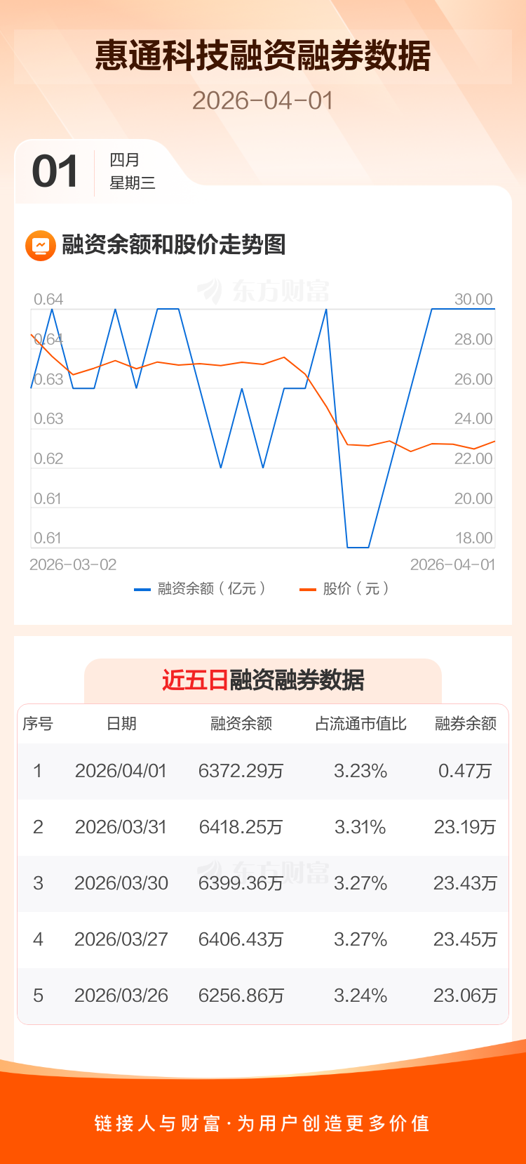 交易所最新数据显示,惠通科技于2026年4月1日获融资买入188.61万元,融资偿还234.57万元,当日融资净偿还45.96万元。目前,该股融资余额6372.29万,占流通市值比例为3.23%。