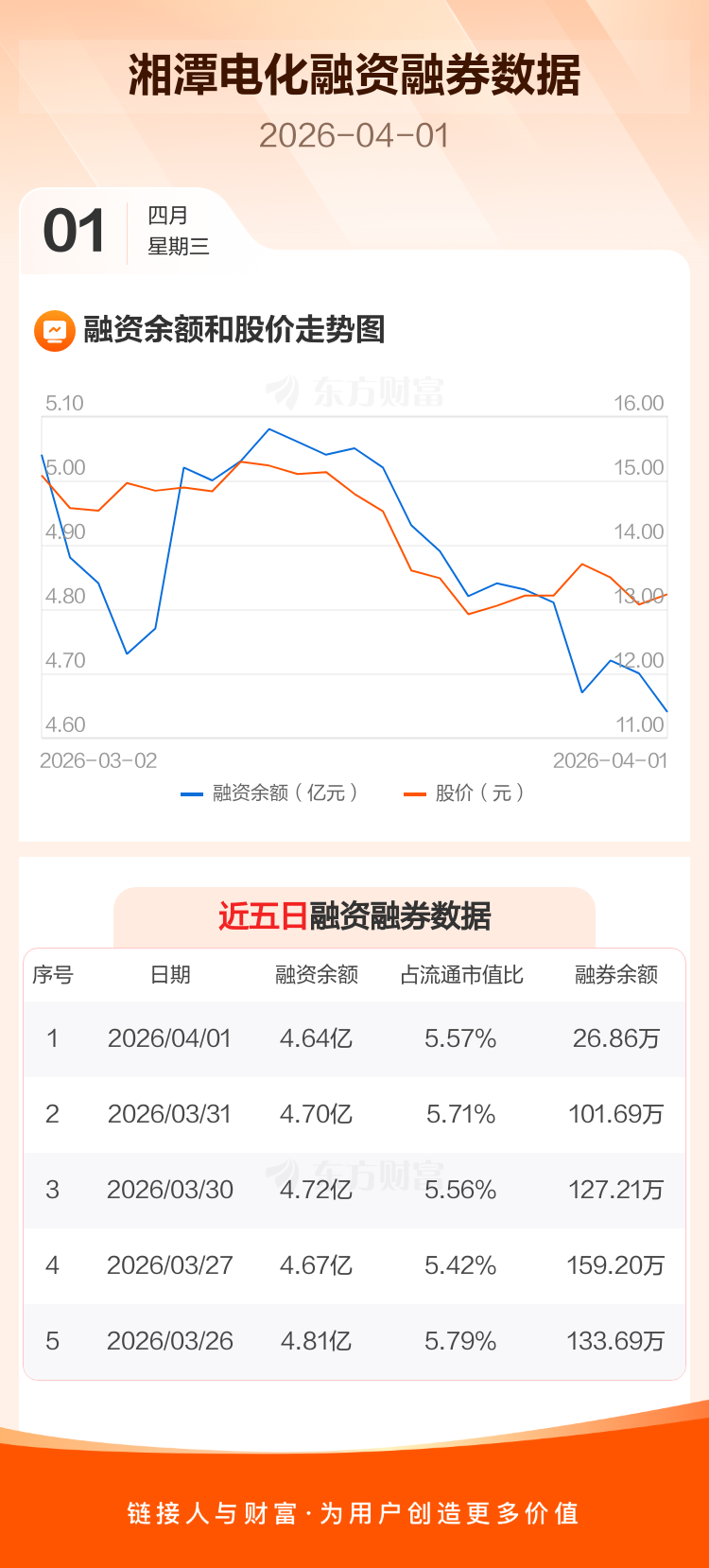 交易所最新数据显示,湘潭电化于2026年4月1日获融资买入2331.26万元,融资偿还2940.99万元,当日融资净偿还609.73万元。目前,该股融资余额4.64亿,占流通市值比例为5.57%。
