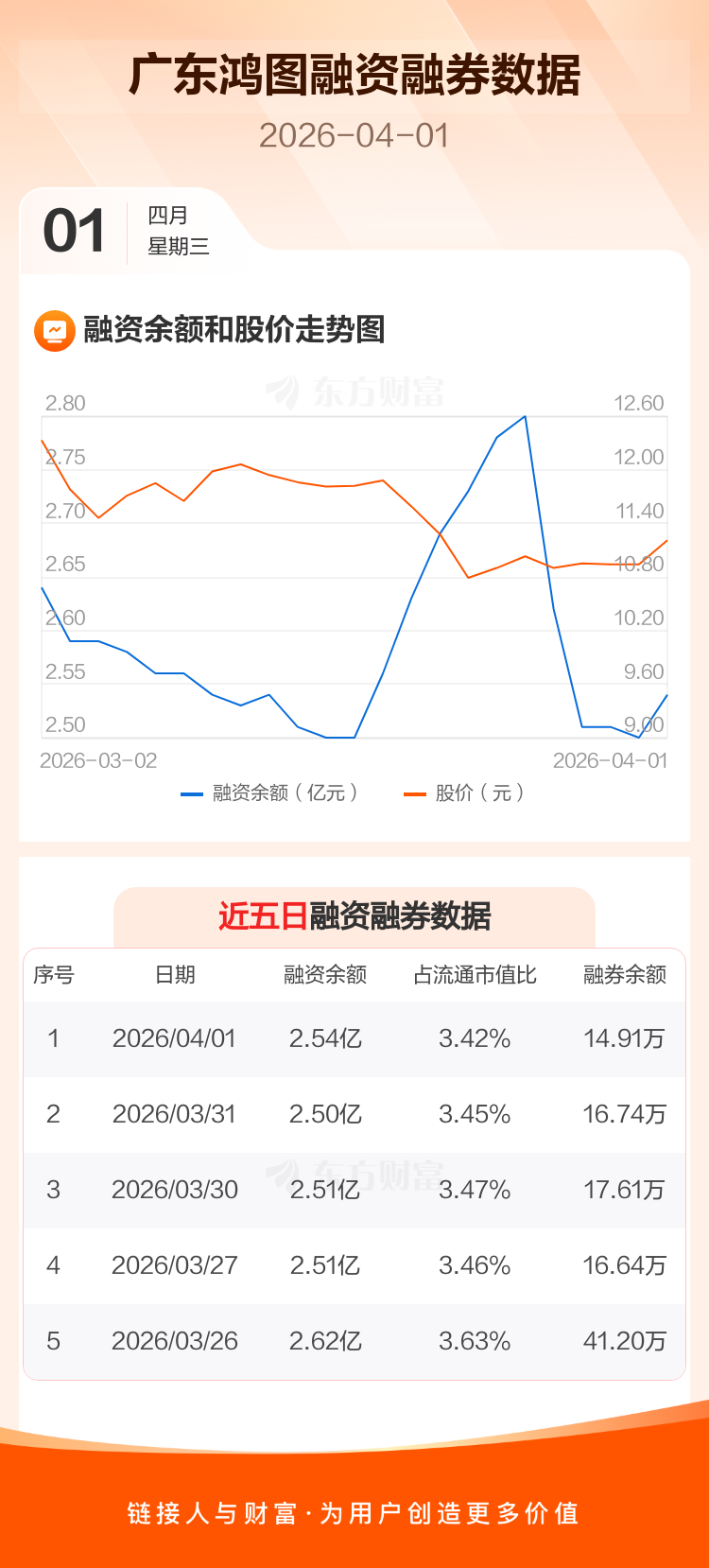 交易所最新数据显示,广东鸿图于2026年4月1日获融资买入827.57万元,融资偿还454.81万元,当日融资净买入372.75万元。目前,该股融资余额2.54亿,占流通市值比例为3.42%。