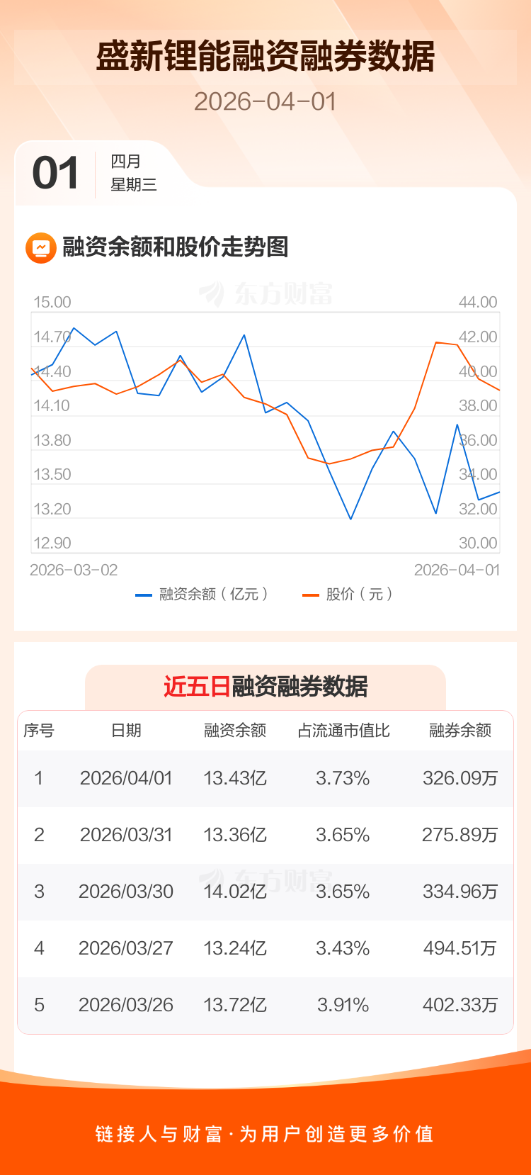 交易所最新数据显示,盛新锂能于2026年4月1日获融资买入1.51亿元,融资偿还1.44亿元,当日融资净买入699.74万元。目前,该股融资余额13.43亿,占流通市值比例为3.73%。