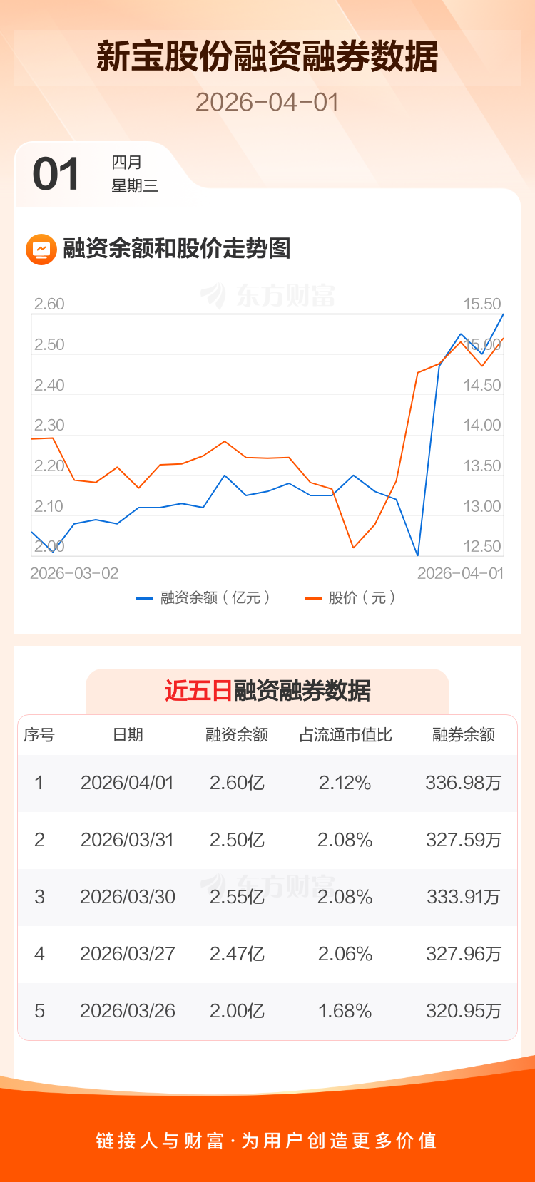 交易所最新数据显示,新宝股份于2026年4月1日获融资买入6075.01万元,融资偿还5013.49万元,当日融资净买入1061.52万元。目前,该股融资余额2.60亿,占流通市值比例为2.12%。