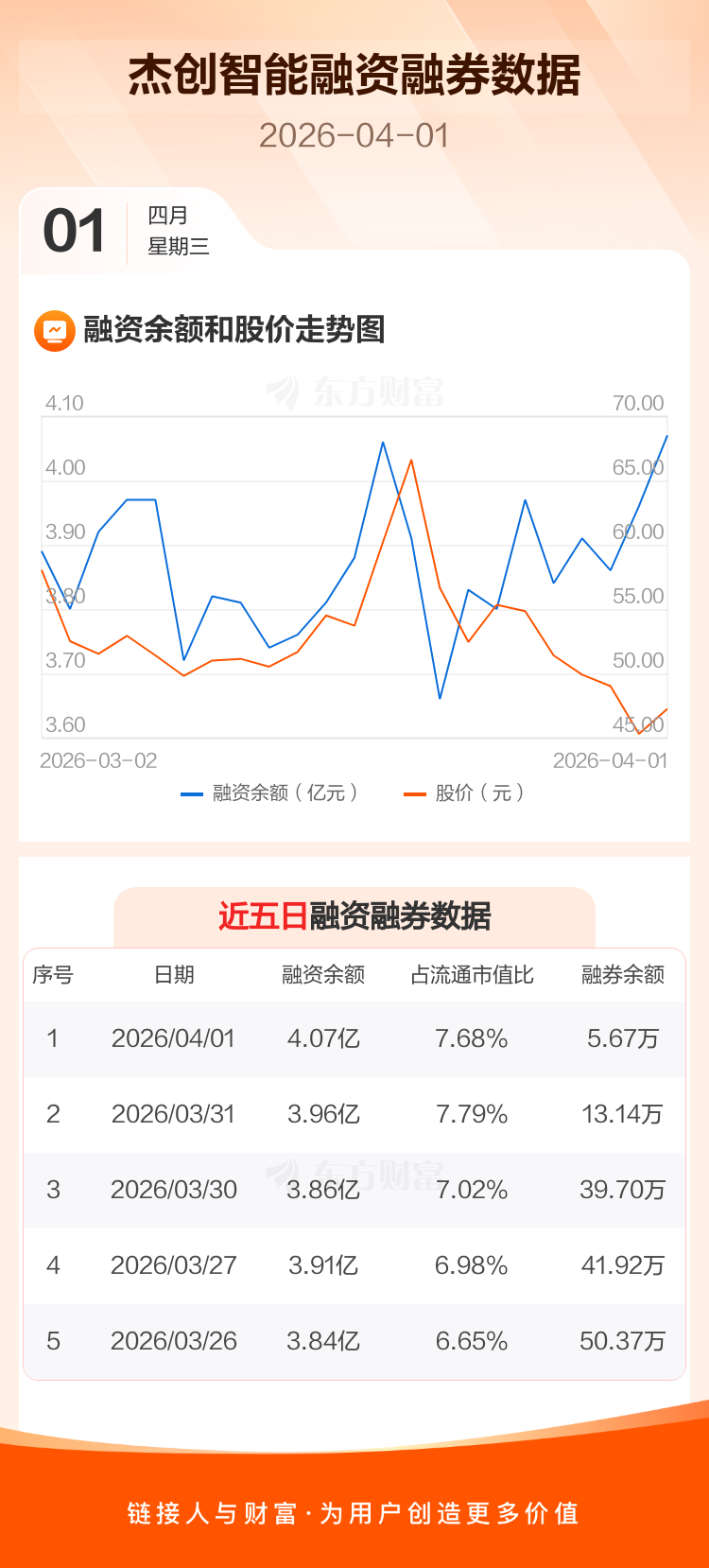 交易所最新数据显示,杰创智能于2026年4月1日获融资买入5658.82万元,融资偿还4577.69万元,当日融资净买入1081.13万元。目前,该股融资余额4.07亿,占流通市值比例为7.68%。