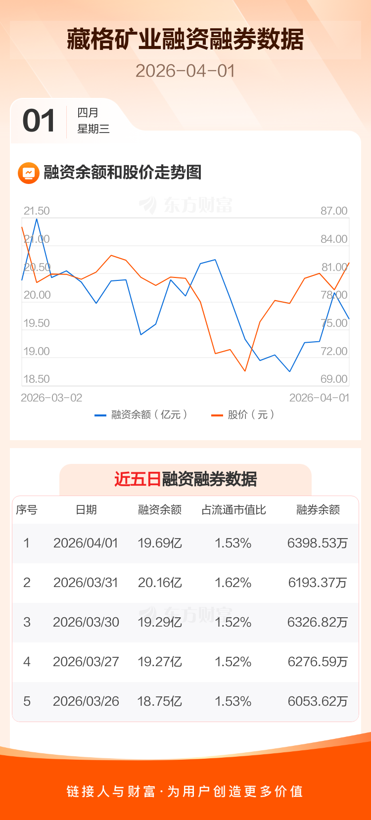 交易所最新数据显示,藏格矿业于2026年4月1日获融资买入9821.42万元,融资偿还1.45亿元,当日融资净偿还4702.36万元。目前,该股融资余额19.69亿,占流通市值比例为1.53%。