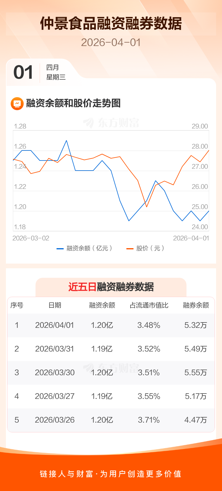 交易所最新数据显示,仲景食品于2026年4月1日获融资买入496.52万元,融资偿还382.85万元,当日融资净买入113.67万元。目前,该股融资余额1.20亿,占流通市值比例为3.48%。