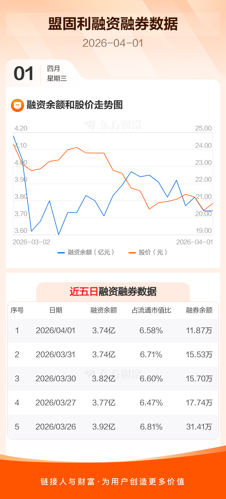 交易所最新数据显示,盟固利于2026年4月1日获融资买入1381.90万元,融资偿还1376.31万元,当日融资净买入5.6万元。目前,该股融资余额3.74亿,占流通市值比例为6.58%。