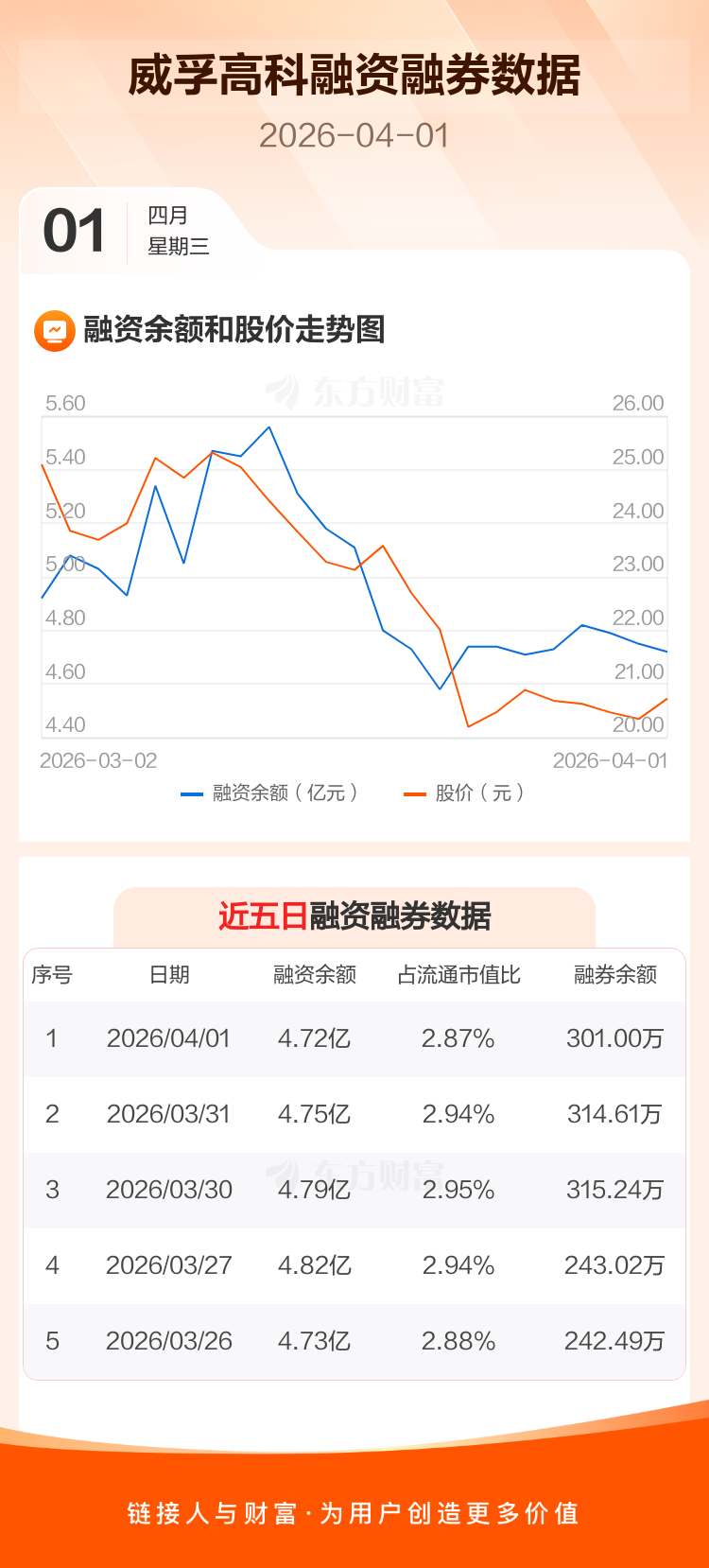 交易所最新数据显示,威孚高科于2026年4月1日获融资买入1849.11万元,融资偿还2121.60万元,当日融资净偿还272.49万元。目前,该股融资余额4.72亿,占流通市值比例为2.87%。