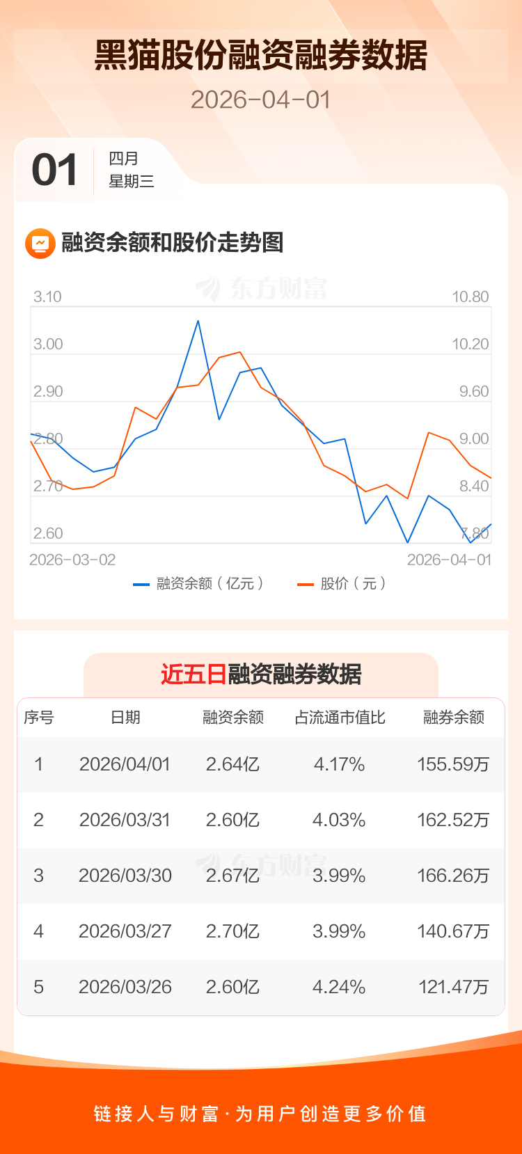 交易所最新数据显示,黑猫股份于2026年4月1日获融资买入1505.50万元,融资偿还1084.08万元,当日融资净买入421.42万元。目前,该股融资余额2.64亿,占流通市值比例为4.17%。