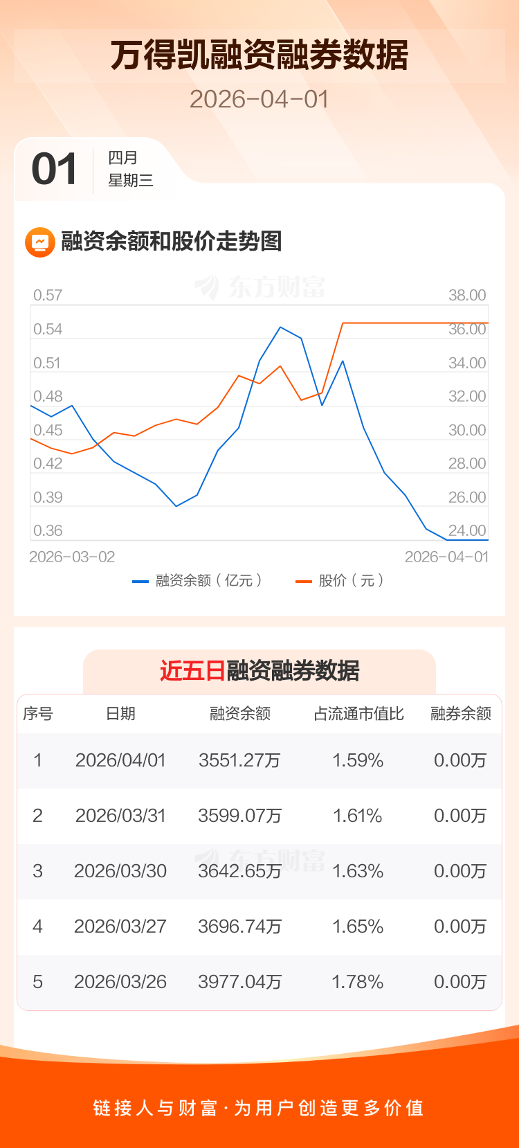 交易所最新数据显示,万得凯于2026年4月1日获融资买入0元,融资偿还47.80万元,当日融资净偿还47.8万元。目前,该股融资余额3551.27万,占流通市值比例为1.59%。
