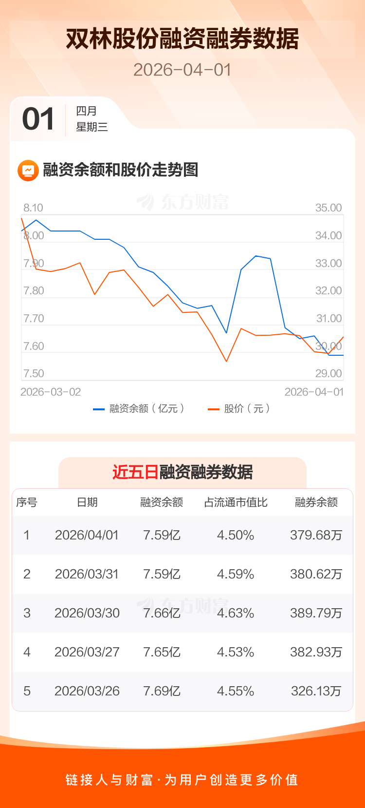 交易所最新数据显示,双林股份于2026年4月1日获融资买入1580.88万元,融资偿还1586.68万元,当日融资净偿还5.8万元。目前,该股融资余额7.59亿,占流通市值比例为4.50%。
