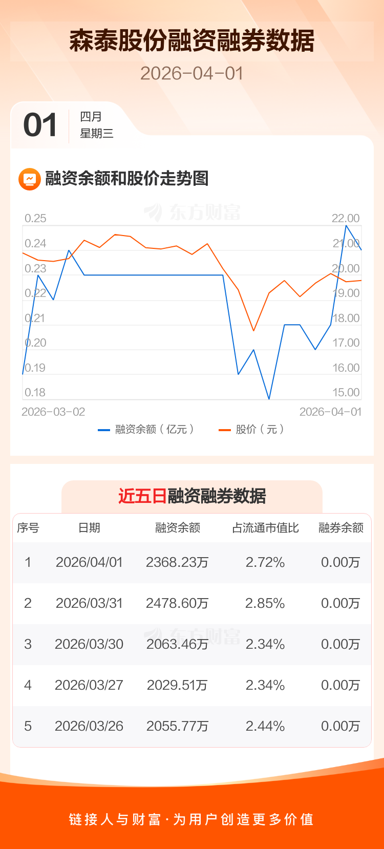 交易所最新数据显示,森泰股份于2026年4月1日获融资买入254.86万元,融资偿还365.22万元,当日融资净偿还110.36万元。目前,该股融资余额2368.23万,占流通市值比例为2.72%。