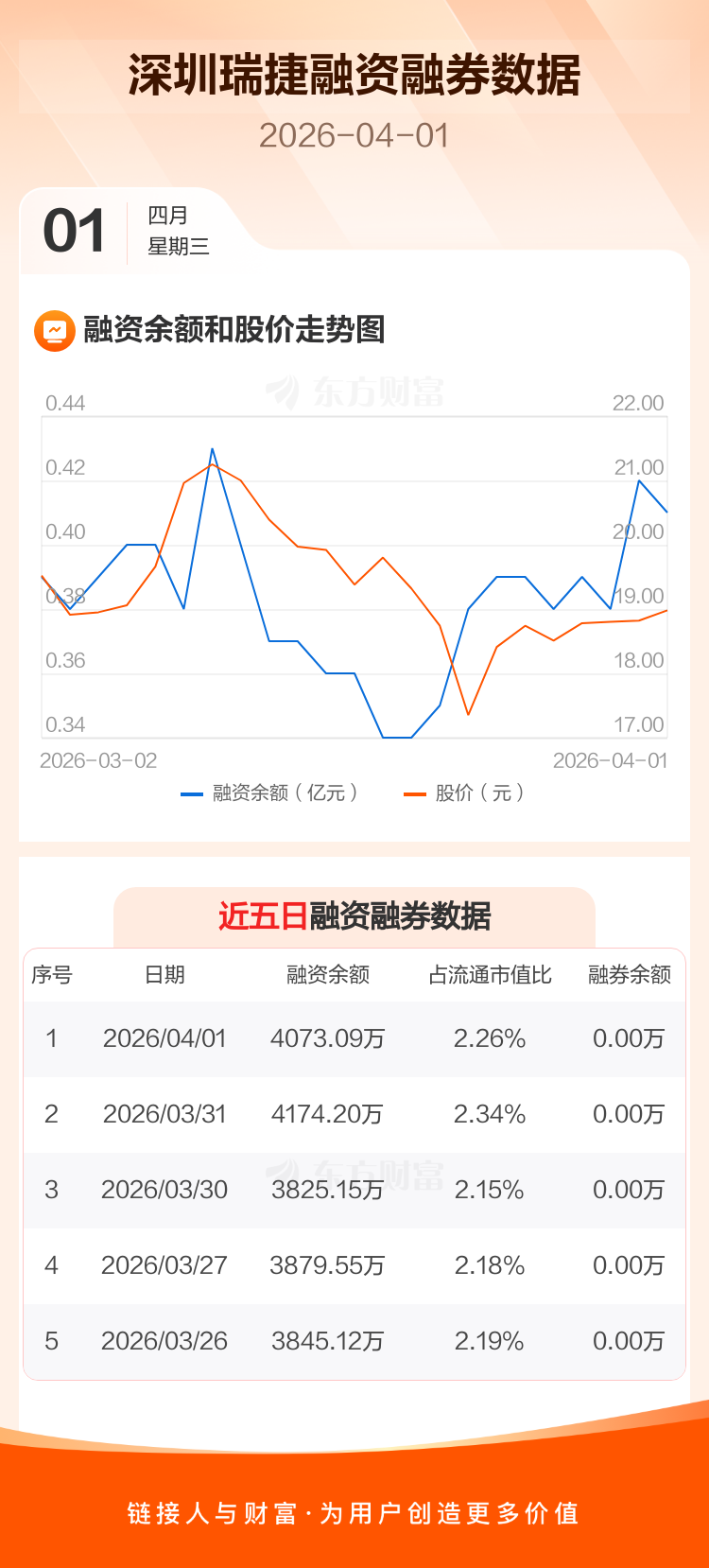 交易所最新数据显示,深圳瑞捷于2026年4月1日获融资买入337.18万元,融资偿还438.30万元,当日融资净偿还101.11万元。目前,该股融资余额4073.09万,占流通市值比例为2.26%。