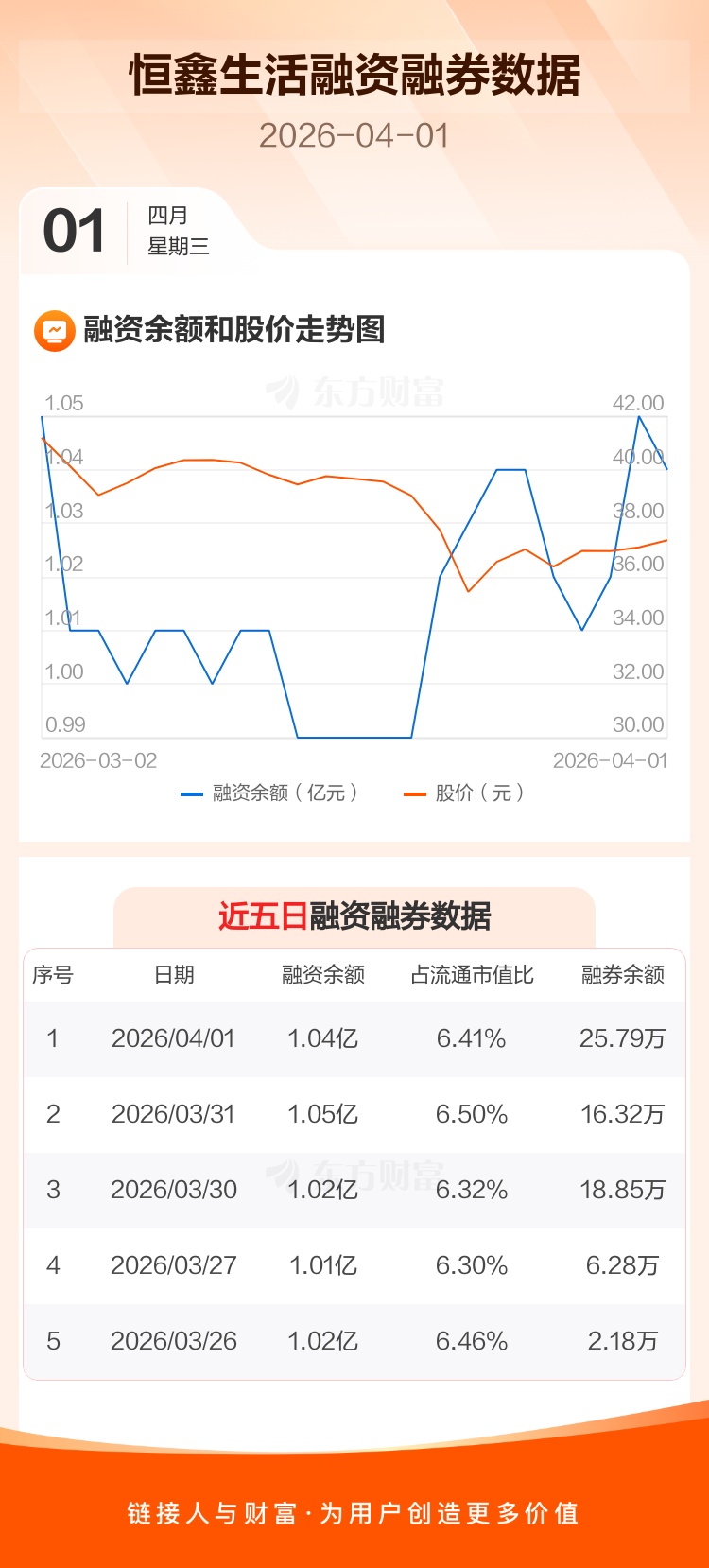 交易所最新数据显示,恒鑫生活于2026年4月1日获融资买入104.12万元,融资偿还172.24万元,当日融资净偿还68.12万元。目前,该股融资余额1.04亿,占流通市值比例为6.41%。